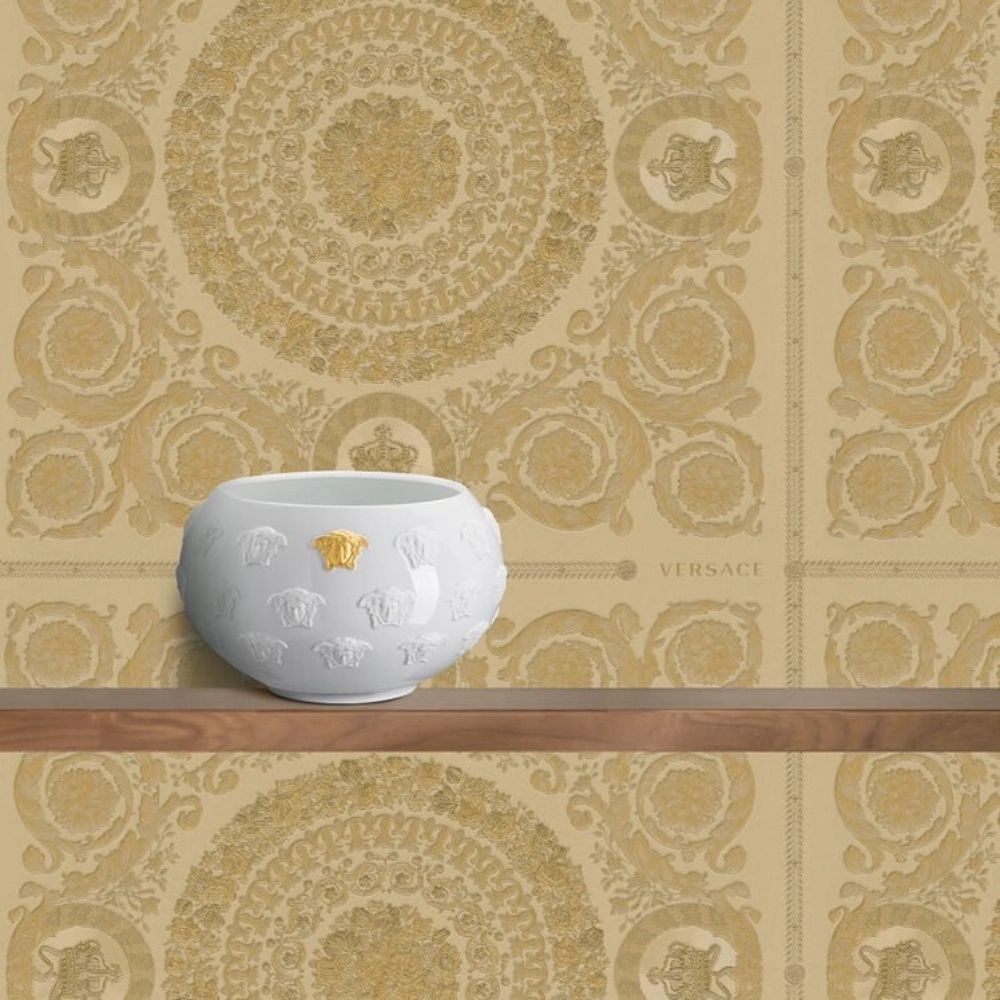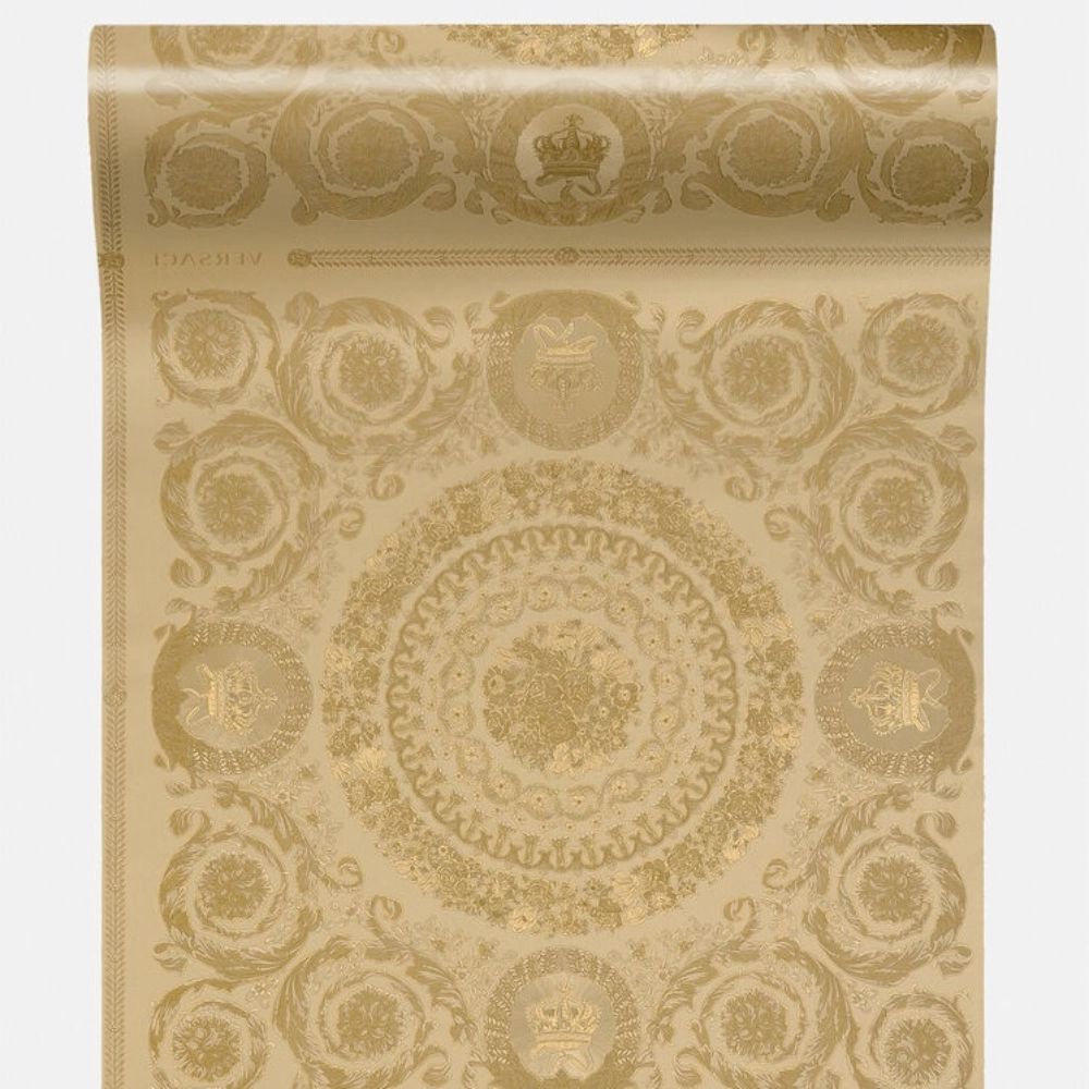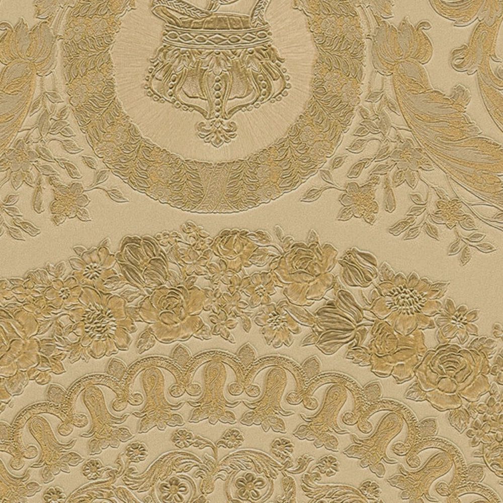 The Heritage print that characterizes this wallpaper boasts a classic Barocco motif from the Fall-Winter 1991 collection. The iconic print features subtle baroque floral elements in gold-tones.