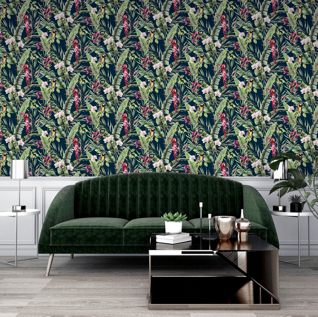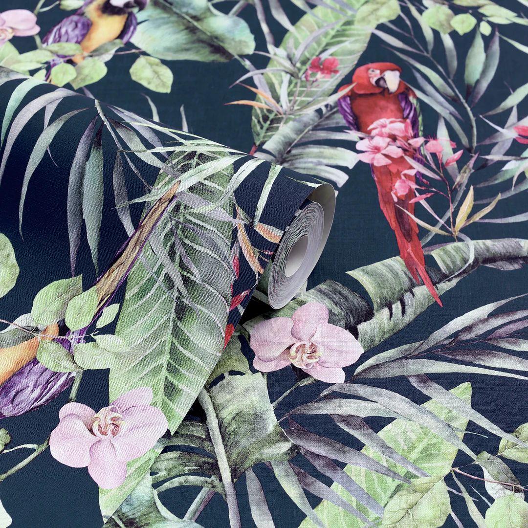 Calculate QuantityA stunning wallpaper design with a truly tropical and exotic feel, this is the perfect option for a dramatic and contemporary interior. With a navy-blue background colour, the bold botanical, floral and animal motifs really stand out. Colourful parrots take centre stage on this jungle themed eye-catching wallpaper. An ideal choice for a feature wall in an open plan living room or for a bedroom.