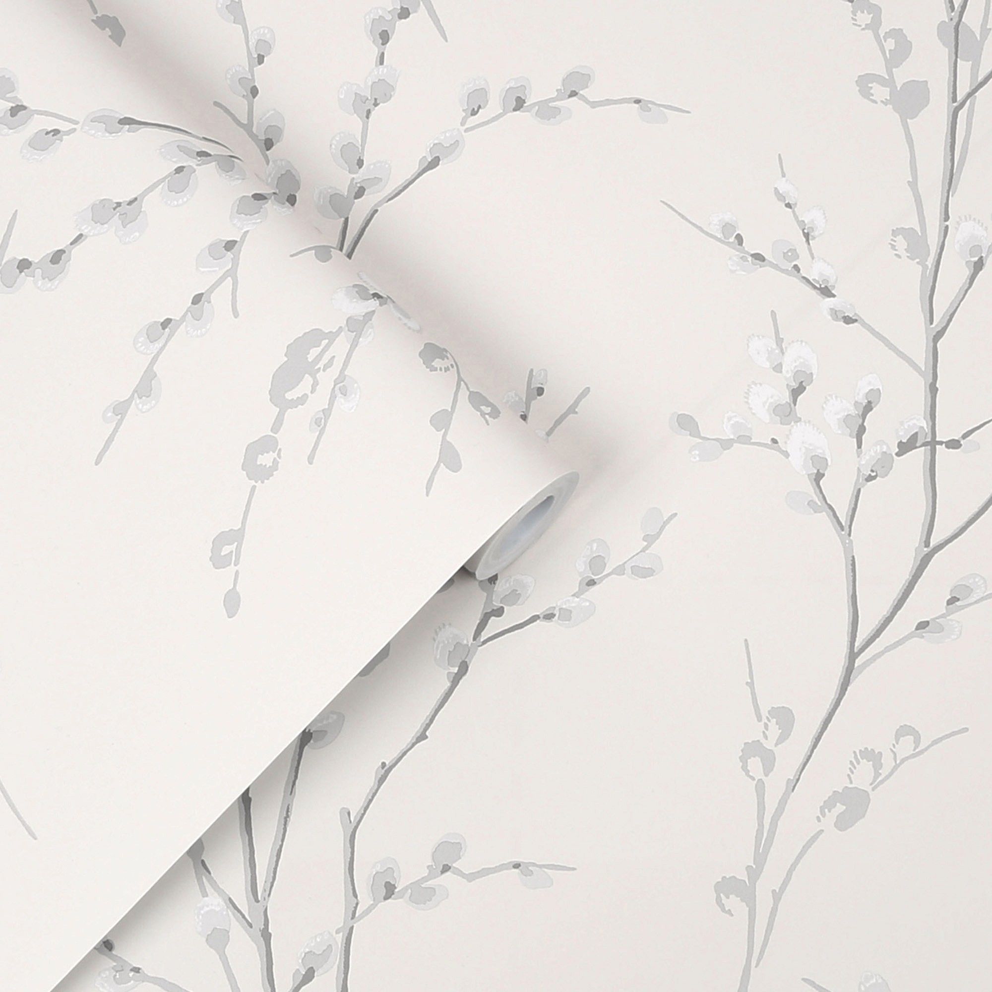 Elevate any room's elegance with Laura Ashley's Pussy Willow print wallpaper, featuring a clean and fresh floral design. The contemporary edge is brought by the steel highlights on an off-white background, making it a stylish addition to any interior.