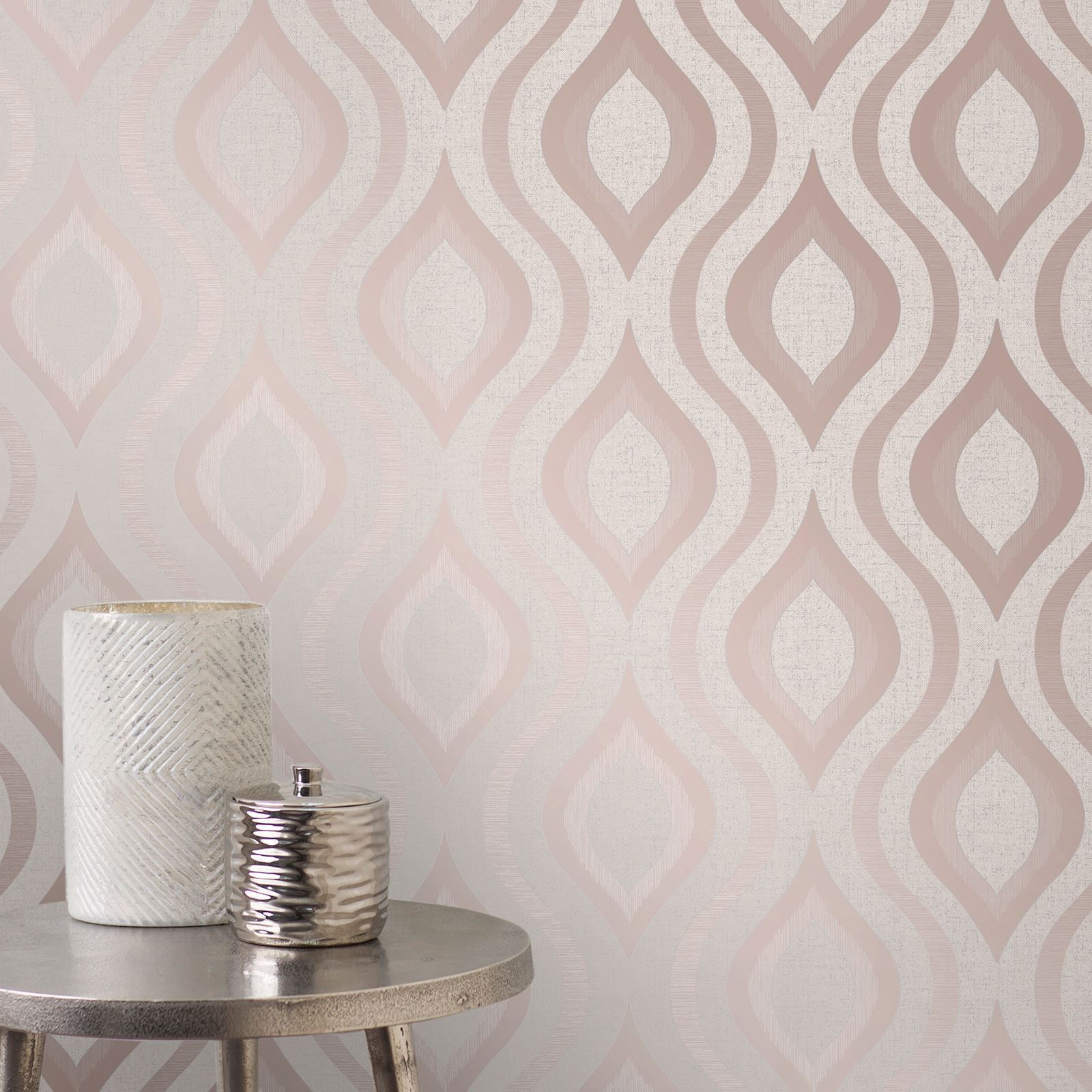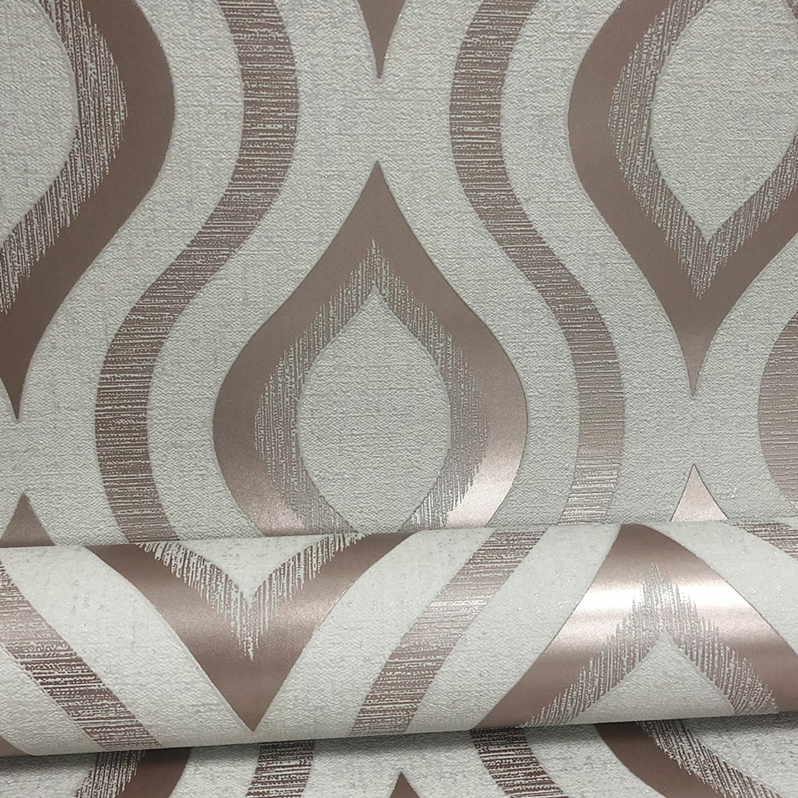 Calculate QuantityA retro-inspired wallpaper gets a stylish update with this Quartz Geometric Wallpaper. The pattern is a classic curving geometric shape that has been modernised with contrasting finishes in textured pale beige with glitter and smooth metallic rose gold. This premium vinyl wallpaper would look fantastic when used with a complementary paper from the Fine Decor Quartz Collection to create a feature wall or to decorate an entire room.