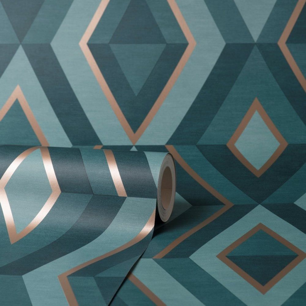 Calculate QuantityShard Geo is a captivating contemporary design that features a faux 3-dimensional effect. Combining tonal shades of teal and metallic gold highlights this wallpaper creates the illusion of depth and the geometric pattern will make a great statement for any modern-day interior. Hang this wallpaper using the traditional paste the paper application method. Please purchase a sample for true texture.