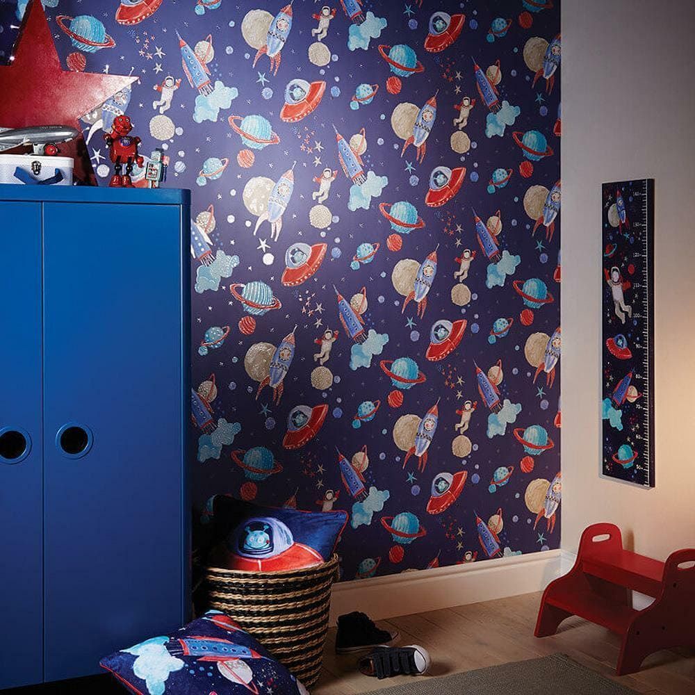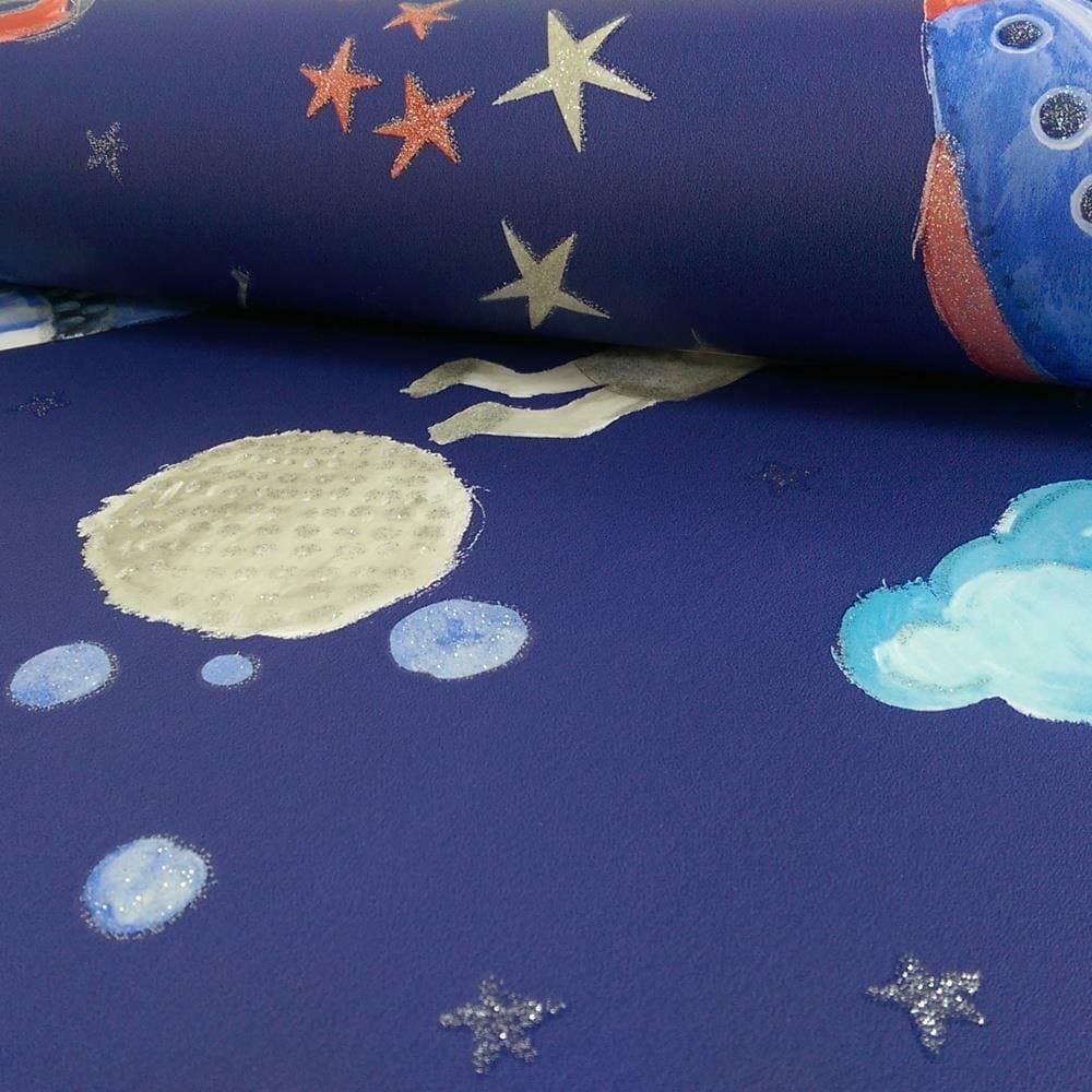 Calculate QuantityAn effortless way to add a splash of colour to your walls is with the Arthouse Space Man Rocket Glitter Blue Wallpaper. You'll love having this eye-catching wallpaper in your house. has a space-themed cartoon design that includes stars, planets, rocket ships, aliens, and astronauts. Everything embellished with glistening silver glitter for a wallpaper that is utterly captivating.