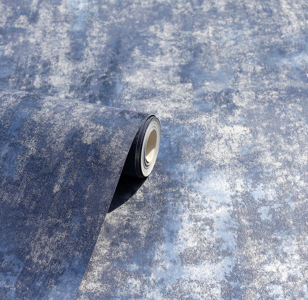 Add a natural vibe to a room with this striking and modern wallpaper. Blending a rough textured stone effect with subtle metallic highlights, the overall look is lived-in yet luxurious - and the mixture of navy blue and silver tones introduce a sense of indulgent warmth. The perfect backdrop to a relaxed living room or dining room, this paper embraces the trend for minerals and organic effects.