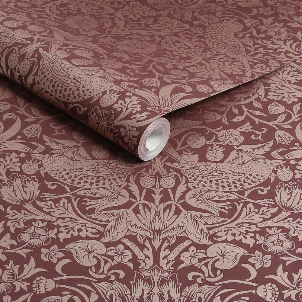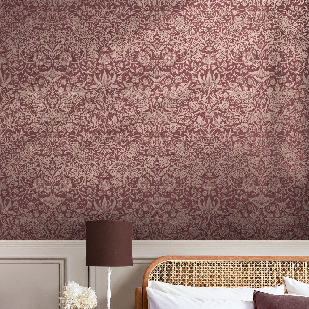 Calculate Quantity"Strawberry Thief" is one of William Morris's signature designs, inspired by thrushes sneaking under strawberry nets at his Kelmscott Manor Garden in Oxfordshire. This intricate pattern was crafted over several days, with hand-carved woodblocks used to layer each colour, making it one of the most premium fabrics produced by Morris & Co. The anticipation of the first print left Morris restless at his Merton Abbey home. Created in 1883, "Strawberry Thief" remains a timeless favourite. The "Strawberry Thief Fibrous Burgundy" variant adds a luxurious touch with a metallic soft gold print set against a rich, textured matte burgundy backdrop, elevating its allure. Paint is available and made to order. Please contact us for further details.
