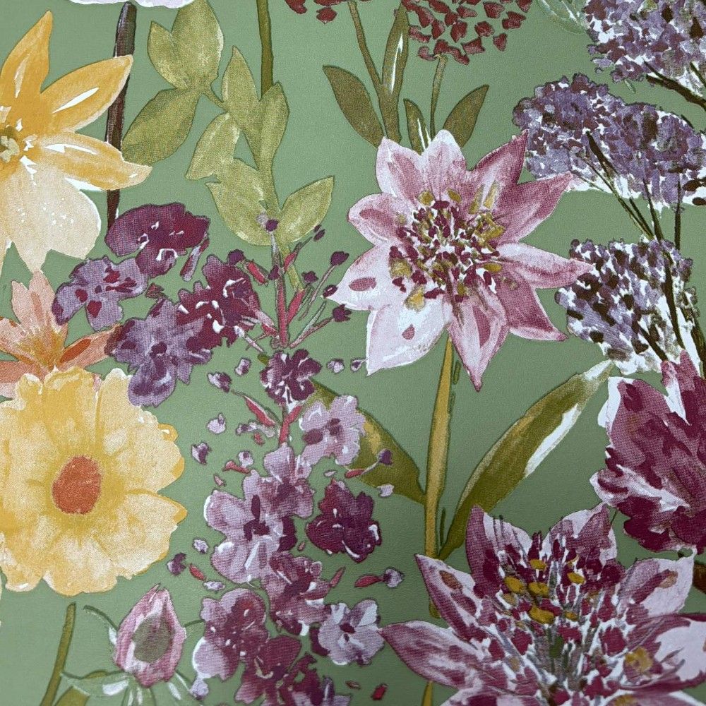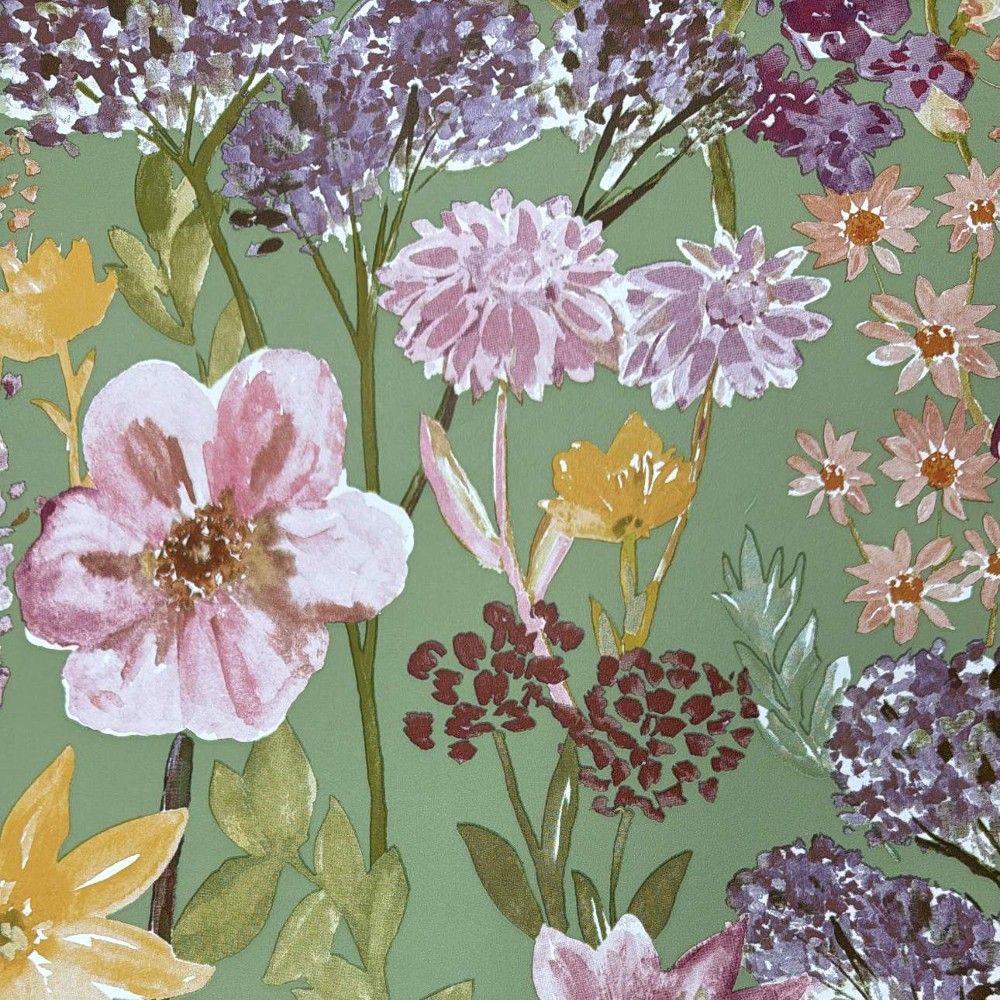 Wildflowers Meadow Sage Green & Orange Floral Wallpaper A61601
