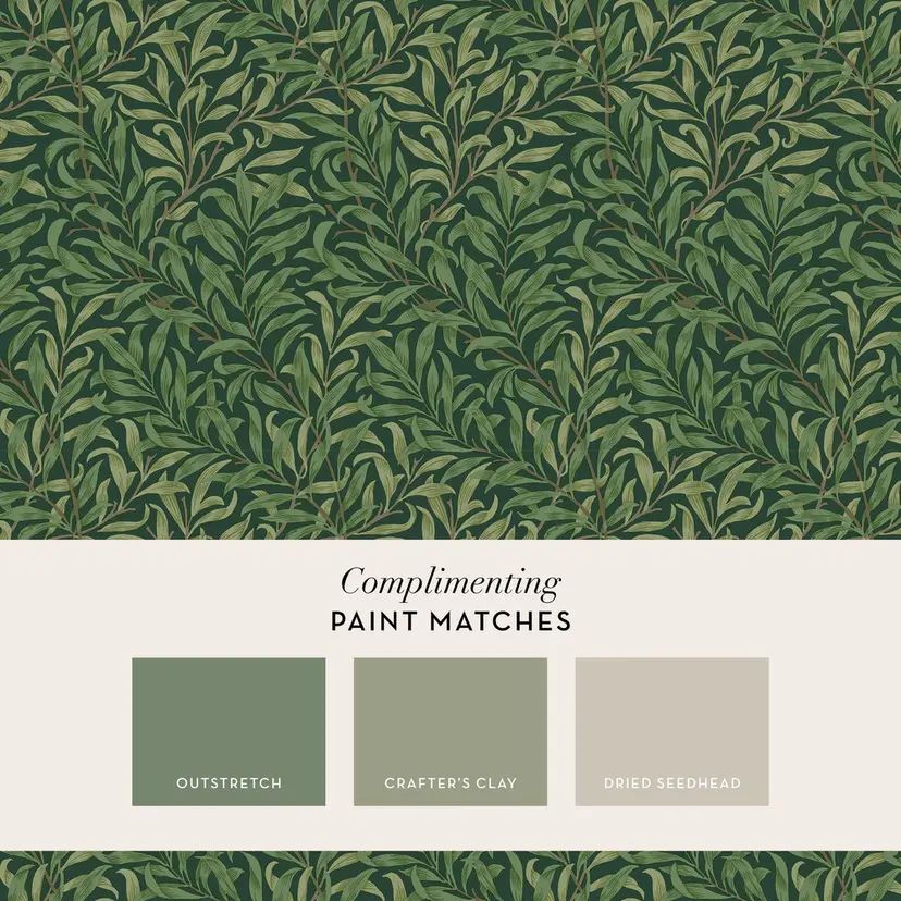 Willow Bough Deep Green Block Printed Diagonal Branch Wallpaper by William Morris 124247